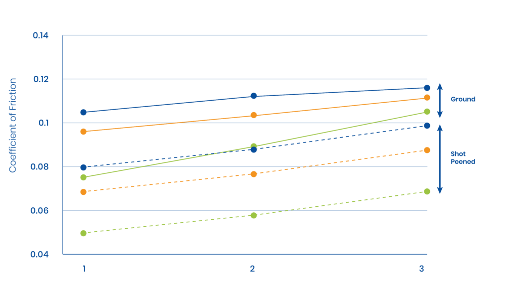 As can be seen from the graph the frictional properties of alloy steels can be significantly reduced by the use of shot peening.